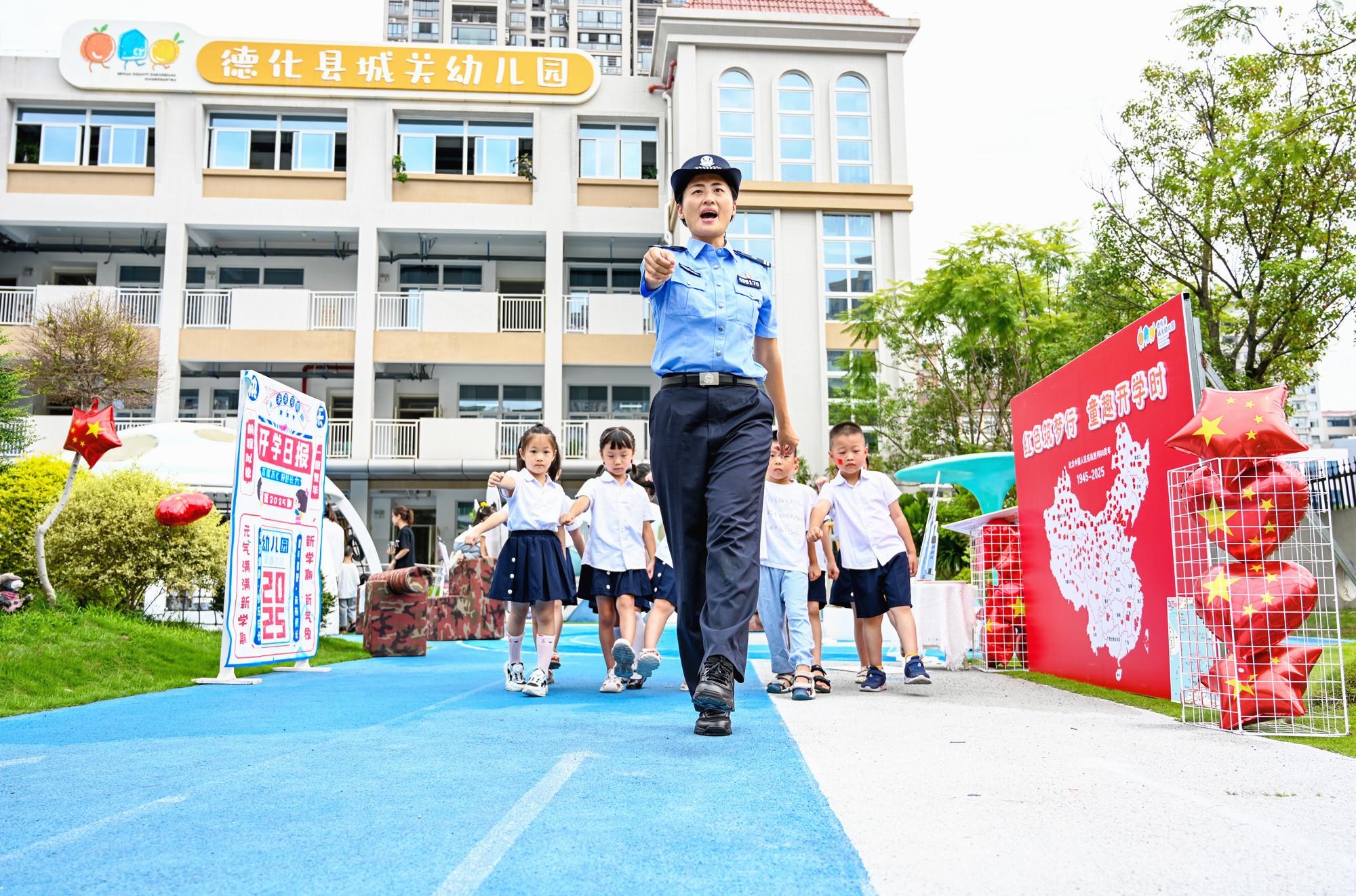 9月1日上午,德化縣公安局民警來到德化縣城關幼兒園,為孩子們帶來了一堂別開生面的“開學第一課”。圖為民警教授孩子們敬禮、齊步走、跨立等隊列動作,帶領孩子們“沉浸式”體驗了一把當小小軍人的榮耀時刻。 |
