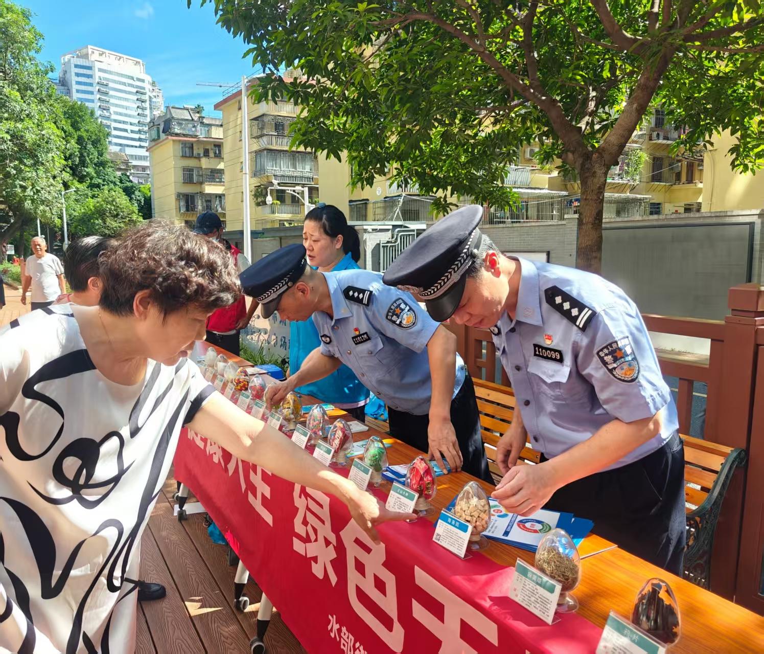 近日,福州市公安局水部派出所聯合水部街道黨工委、辦事處,在建華社區開展禁毒警示教育宣傳活動。圖為民警向群眾詳細介紹當前常見的偽裝毒品。 |
