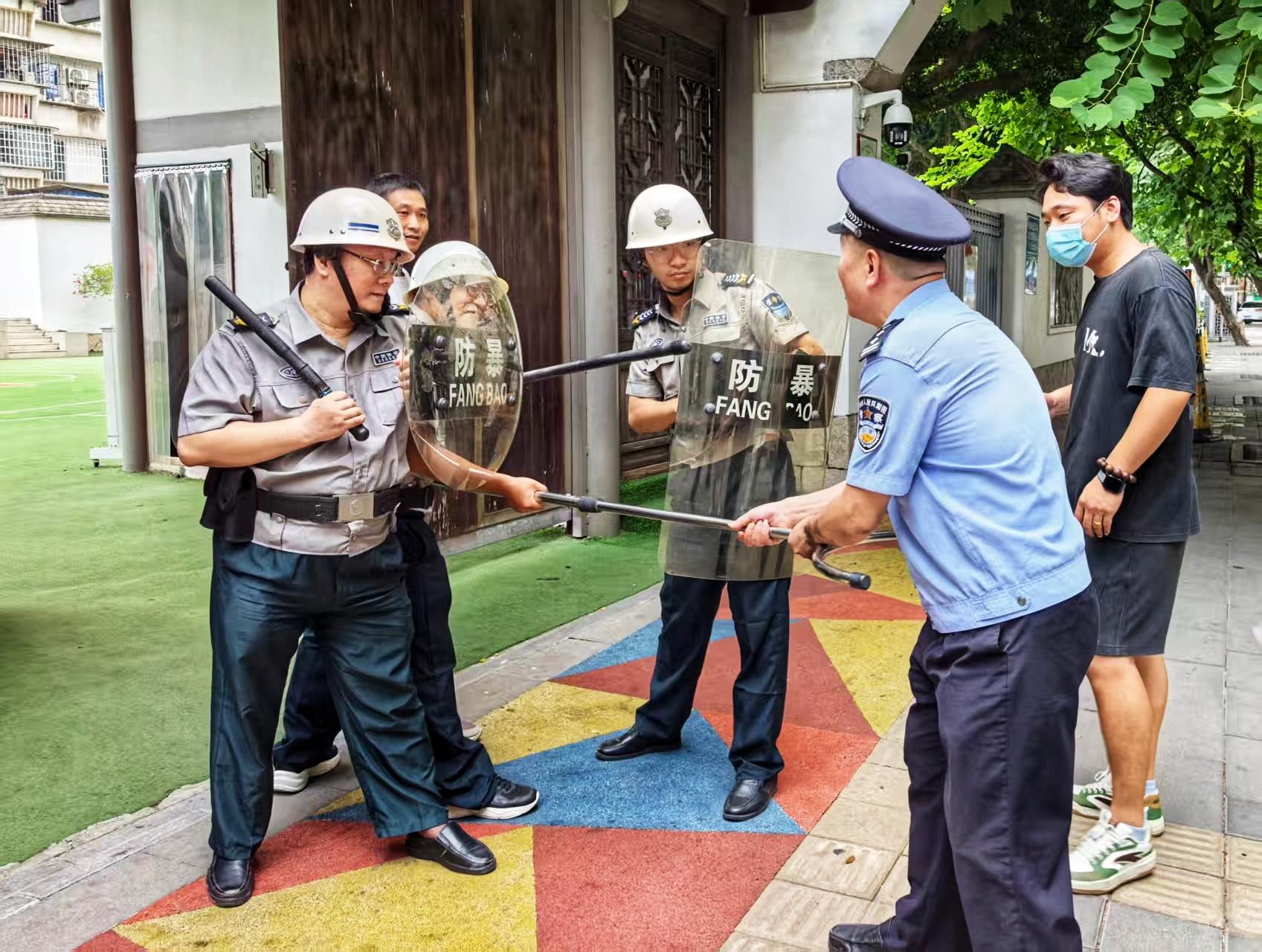 近日,福州市公安局安泰派出所民警深入轄區(qū)學(xué)校組織校園安保人員開展反恐安全演練。其間,民警為安保人員詳細(xì)講解反恐防暴知識(shí),現(xiàn)場(chǎng)示范了防暴盾牌、鋼叉等器械的正確使用方法。圖為民警向安保人員演示鋼叉等器械的正確使用方法。 |