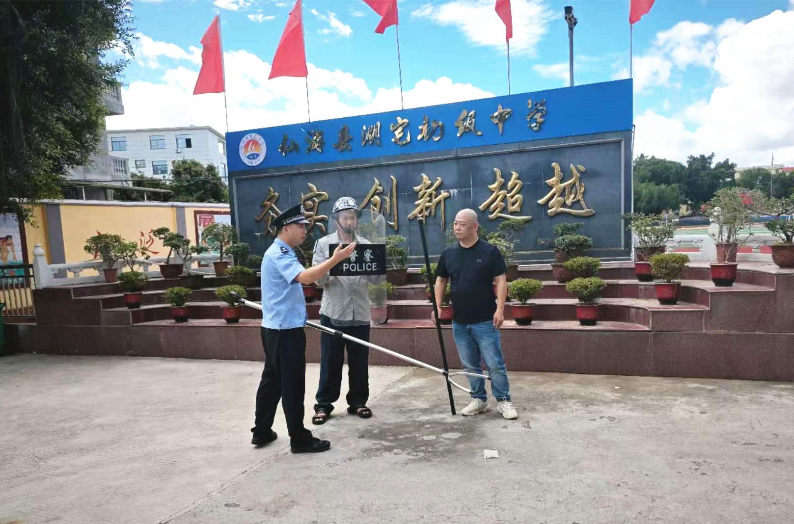 近日,仙游縣公安局郊尾派出所民警走進轄區(qū)湖宅初級中學,開展反恐防暴演練活動,有效提升轄區(qū)校園應對突發(fā)暴恐事件的能力,保障師生的人身安全。 圖為民警指導安保人員器械的正確使用方式。 |