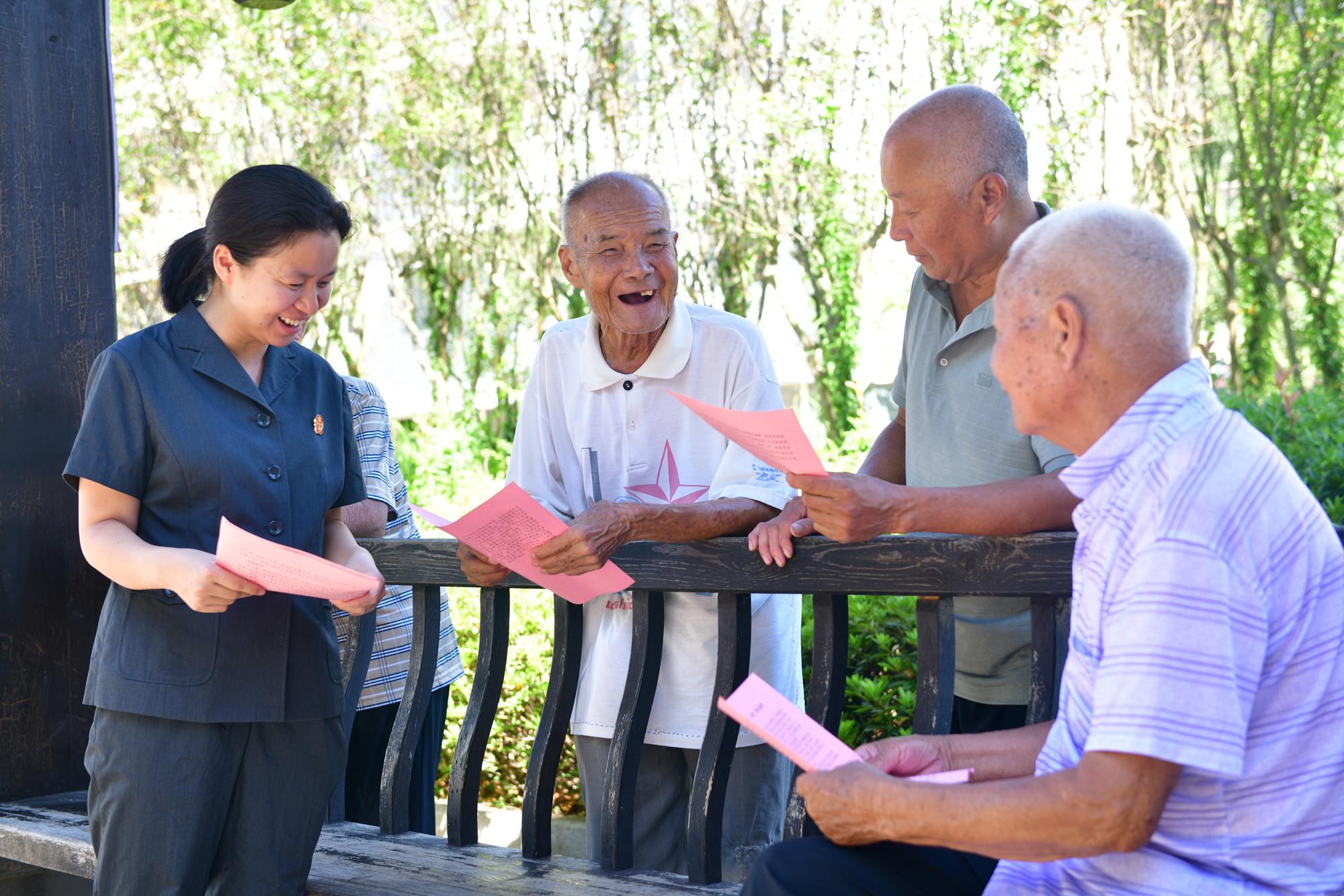 近日,長汀縣人民法院聯合新民社區開展“守護綠水青山 共筑金山銀山”普法宣傳活動。圖為法官向社區老年人講解與日常生活密切相關的涉生態法律知識。 |