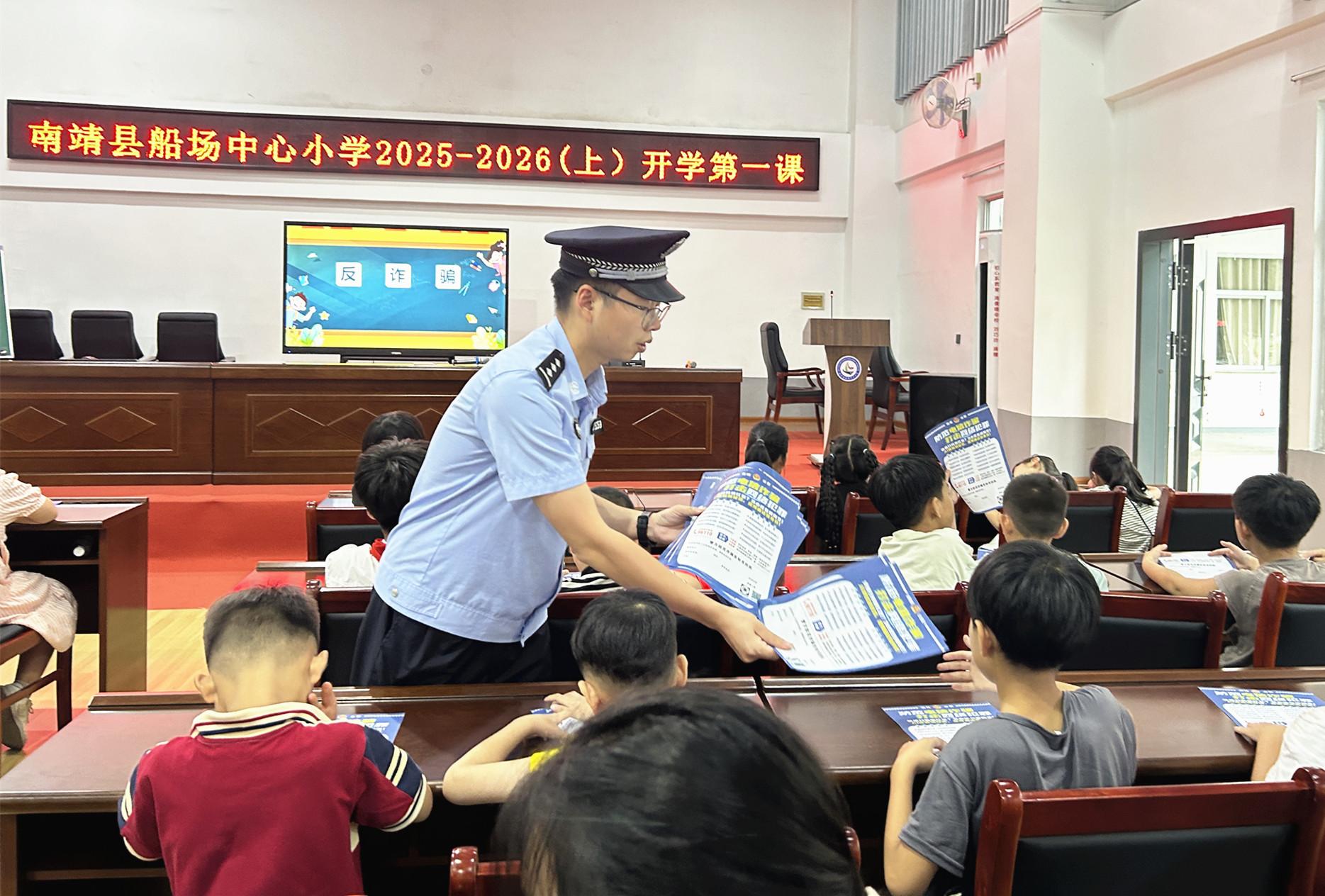 近日,南靖縣公安局船場派出所民警深入船場鎮(zhèn)中心小學(xué),開展法治宣傳活動(dòng)。其間,民警以現(xiàn)實(shí)案例為引子,將“法不能向不法讓步”的法治精神傳遞給每一位同學(xué),鼓勵(lì)大家勇敢對(duì)校園欺凌說“不”。圖為民警向同學(xué)們發(fā)放宣傳材料。 |