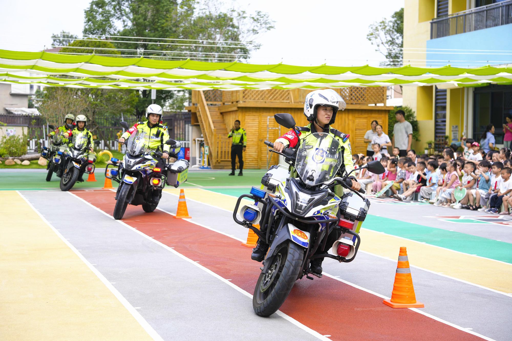 近日,龍巖市公安局新羅分局與交通管理支隊新羅大隊民警深入轄區龍巖市第二幼兒園,開展安全普法宣傳與交通安全宣傳活動。圖為交警鐵騎展示駕駛技能。 |