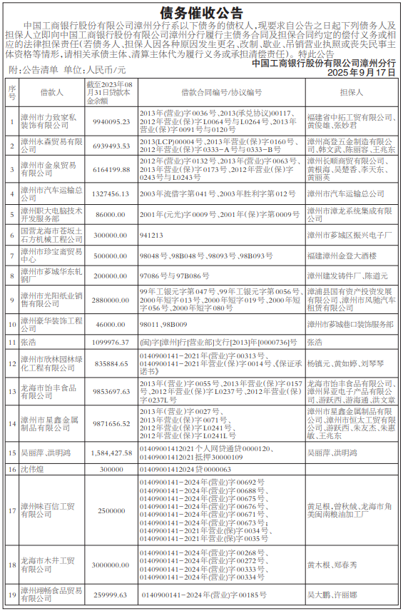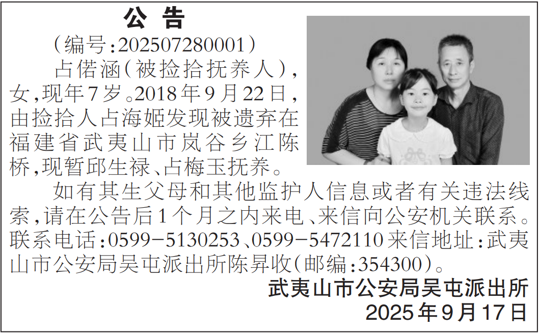 認領公告 2025年9月9日12時01分我單位北壁鄉上岐村附近海域查獲一艘無船名船號的大馬力快艇,船長約15米,船寬約3米,船身涂刷藍色油漆,尾部懸掛兩臺SUZUKI牌發動機。此后,經多方調查仍無法查明該船舶的所有人。現依法將該船舶予以公告,請該船舶所有人自公告之日起六個月內到我單位認領并說明情況,逾期未認領的,將依法予以處置。(聯系電話:0593-8507110,聯系地址:寧德市霞浦縣北壁鄉東沖村118號) 寧德海警局霞浦第一工作站 2025年9月17日 認領公告 2025年9月9日12時01分我單位于北壁鄉上岐村附近海域查獲一艘無船名船號快艇,船長約12米,船寬約3米,船身涂刷白色油漆,船艙涂刷藍色油漆,尾部懸掛一臺雅馬哈發動機。此后,經多方調查仍無法查明該船舶的所有人。現依法將該船舶予以公告,請該船舶所有人自公告之日起六個月內到我單位認領并說明情況,逾期未認領的,將依法予以處置。(聯系電話:0593-8507110,聯系地址:寧德市霞浦縣北壁鄉東沖村118號) 寧德海警局霞浦第一工作站 2025年9月17日 王成松、王愛欽: 本會受理申請人福建中創新型材料科技有限責任公司與被申請人王成云、王成松、王愛欽、福建鴻磊建設工程有限公司之間的買賣合同糾紛案[(2025)榕仲受939號],現向你們公告送達《案件受理通知書》《仲裁規則》《仲裁員名冊》《仲裁申請書》及證據材料等。本公告自發出之日起60日即視為送達。答辯、選定仲裁員期限為公告期滿后15日內,舉證期限為公告期滿后20日內。本案將于選定仲裁員期限屆滿后第一個工作日組成仲裁庭,于2025年12月17日下午15:00在本會第一仲裁室開庭審理。請于仲裁庭組成后第一個工作日到本會領取《仲裁庭組成人員通知書》《開庭通知書》,逾期,視為送達。 福州仲裁委員會 2025年9月17日 閩清縣勞動人事爭議仲裁委員會公告 閩清縣上德培訓學校: 本委受理劉昊、桂文娟與你公司有關勞動報酬爭議(梅勞人仲案字〔2025〕第47號、梅勞人仲案字〔2025〕第48號)案件已審理終結。因你單位作為本案被申請人且無法聯系,現依法向你單位公告送達本委于2025年9月1日作出的梅勞人仲案字〔2025〕第47號《裁決書》、梅勞人仲案字〔2025〕第48號《裁決書》。請于本公告發布之日起三十日內到本委(福州市閩清縣梅城鎮梅城大街94號人社局一樓辦公室)領取,逾期即視為送達。如不服本裁決,可在公告期滿后十五日內向有管轄權的人民法院提起訴訟,逾期不起訴本裁決即發生法律效力。 閩清縣勞動人事爭議仲裁委員會 2025年9月17日 福建誠智律師事務所解散公告 根據《中華人民共和國律師法》第22條、《律師事務所管理辦法》第32條等相關規定,福建誠智律師事務所(組織形式:普通合伙,統一社會信用代碼:313500004897267036)經全體合伙人一致達成并通過合伙人會議決議,決定解散福建誠智律師事務所,并依法向登記機關申請注銷。本律師所采取自行清算的方式,由全部合伙人組成清算組,負責處理本律師所解散的清算事宜。請與本律師所有債權債務關系的單位或個人,自本公告見報之日起15日內,持有效債權憑證向本律師事務所清算組申報并清理,逾期未申報者,視為自動放棄權利。 清算組負責人:沈錦生,聯系電話:13806901165 特此公告。 福建誠智律師事務所 2025年9月17日 遺失聲明公告 茲有福建仙洋洋生物科技有限公司公章一枚于8月20日不慎遺失,特此聲明作廢。自遺失之日起,任何使用該公章的行為均無效,特此公告。 福建仙洋洋生物科技有限公司 2025年9月17日 遺失聲明 福州市長樂區七安公寓有限公司不慎遺失公章一枚,編碼:35018210047602,現聲明作廢。 福州市長樂區七安公寓有限公司 2025年9月17日 遺失聲明 南平市建陽區和美幼兒園不慎遺失銀行開戶許可證一份(核準號:J4014000815901;編號:3910-01948857;開戶銀行:中國建設銀行股份有限公司建陽支行;賬號:35050167720700000203),現聲明作廢。 南平市建陽區和美幼兒園 2025年9月17日 遺失聲明 徐水森,不慎遺失光澤縣止馬鎮人民政府開具的福建省行政事業單位資金往來結算票據一份,票據內容:衛生保潔責任金,票據號01005391,金額:4000元,現聲明作廢。 聲明人:徐水森 2025年9月17日 債權轉讓公告 2025年9月5日,福建省浦口建筑工程有限公司將對福建藍海房地產開發有限公司的主債權及其項下全部權利,以簽訂《債權轉讓協議》方式依法轉讓給林霄。福建省浦口建筑工程有限公司與林霄聯合公告通知債務人等上述債權轉讓事實,并請債務人履行還款義務。 聲明人:林霄 2025年9月17日 公告 2023年4月10日我所辦理的電動車盜竊案中,在晉安區斗門紅星小區雜物間有輛電動車被盜3粒電瓶,目前沒有找到物主,請當事人自登報之日起六個月內到火車站派出所辦理認領手續,逾期將依據相關法律法規上繳國庫,特此公告! 福州市公安局火車站派出所 2025年9月17日 公告 福州市公安局遠洋派出所辦理的案件中,有4部電動車、40份電子產品、19份生活用品、5部自行車等物品沒有找到物主,請當事人自登報之日起六個月內到遠洋派出所辦理認領手續,逾期將依據相關法律法規上繳國庫,特此公告! 福州市公安局遠洋派出所 2025年9月17日 遺失聲明 福清市龍江街道安民村遺失《福建省村集體專用收款票據》第二聯收據1張,票據號碼:5455597,金額:1200元,特此聲明作廢。 福清市龍江街道安民村 2025年9月17日 遺失聲明 泉州一壺好茶人力