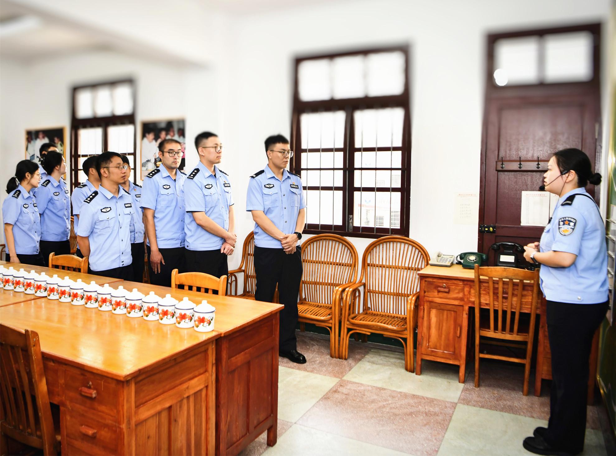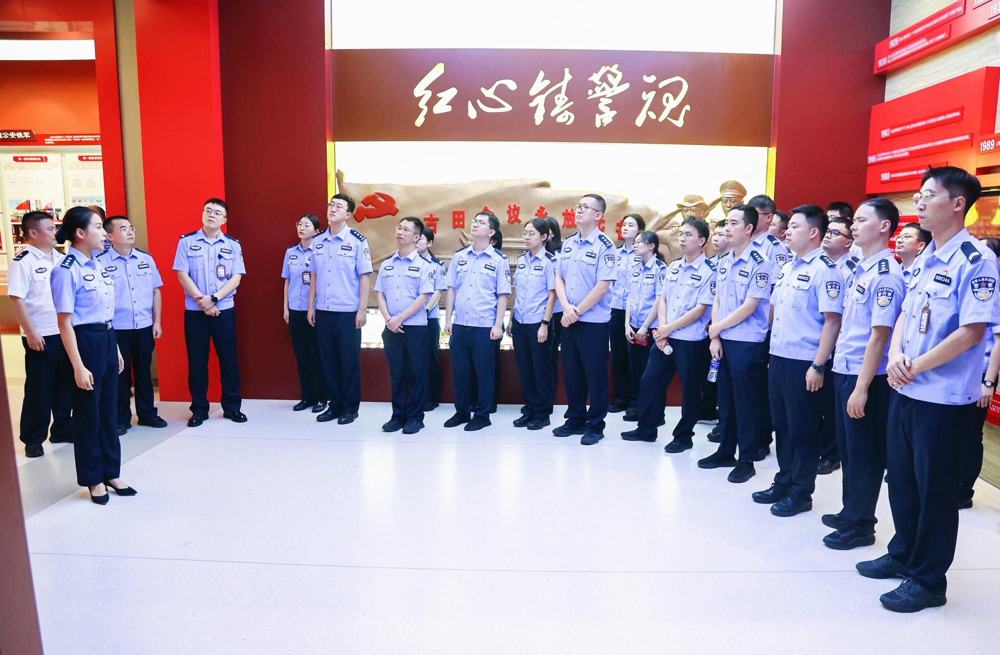青年民警在上杭縣古田會議會址旁重溫入黨誓詞。(李發烜 攝) 這是福建省公安廳開展廳機關青年民警沉浸式忠誠教育的生動縮影。為幫助青年民警進一步鑄牢忠誠警魂、提升警務素養,9月10日至12日,省公安廳政治部組織新招錄博士選調生,先后赴龍巖、漳州、廈門等地公安機關,開展沉浸式忠誠教育,走進全國“公安楷模”上杭縣公安局古田派出所、“時代楷模”漳州市公安局漳州110支隊、“全國公安模范單位”廈門市公安局思明分局蓮前派出所等基層一線,追溯公安紅色足跡,弘揚公安英模精神,激發奮勇爭先動力,為推進公安工作現代化貢獻青年力量。 星星之火,點亮忠誠警魂 逶迤蒼茫的社下山,參天古木掩映處,“古田會議永放光芒”八個大字熠熠生輝。 在上杭縣公安局古田派出所,青年民警聆聽首批老民警邱永康講述忠誠故事。(郭榮哲 攝) 青年民警走進古田會議會址,當年的長條桌、木椅等陳設依舊如故。“在這里,確立了思想建黨、政治建軍原則,為黨和軍隊發展指明方向。”古田派出所民警林南富有感情地介紹道。青年民警一邊細細聆聽,一邊輕撫斑駁墻壁,似與先輩隔空對話,深切感悟他們堅定的理想信念和對黨的絕對忠誠。 當年奮進突圍的槍炮聲猶如在耳,如今打擊犯罪的行動就在眼前。 “雖然當時條件很艱苦,但想到當年紅軍在這里戰斗,我們就義無反顧保護人民安全。”在古田派出所,現年92歲的首批民警邱永康激昂慷慨地回憶,建所初期那段激情歲月深深感染著在場青年民警。這也是古田派出所把紅色資源利用好、把紅色傳統發揚好、把紅色基因傳承好,始終做“紅軍式警隊”的由來。 隨后,古田派出所所長童建強帶領大家參觀所里的忠誠教育館:“我們所始建于1959年,60多年來始終把古田會議精神作為立警之本。”如今,古田派出所聚焦派出所“主防”職能,堅持科技興警,推出了“派出所+警務生態圈”等一系列治安新模式,成立女警巡邏服務隊,積極打造高效能預防警務,讓古田鎮成為“夜不關門的紅色小鎮”。