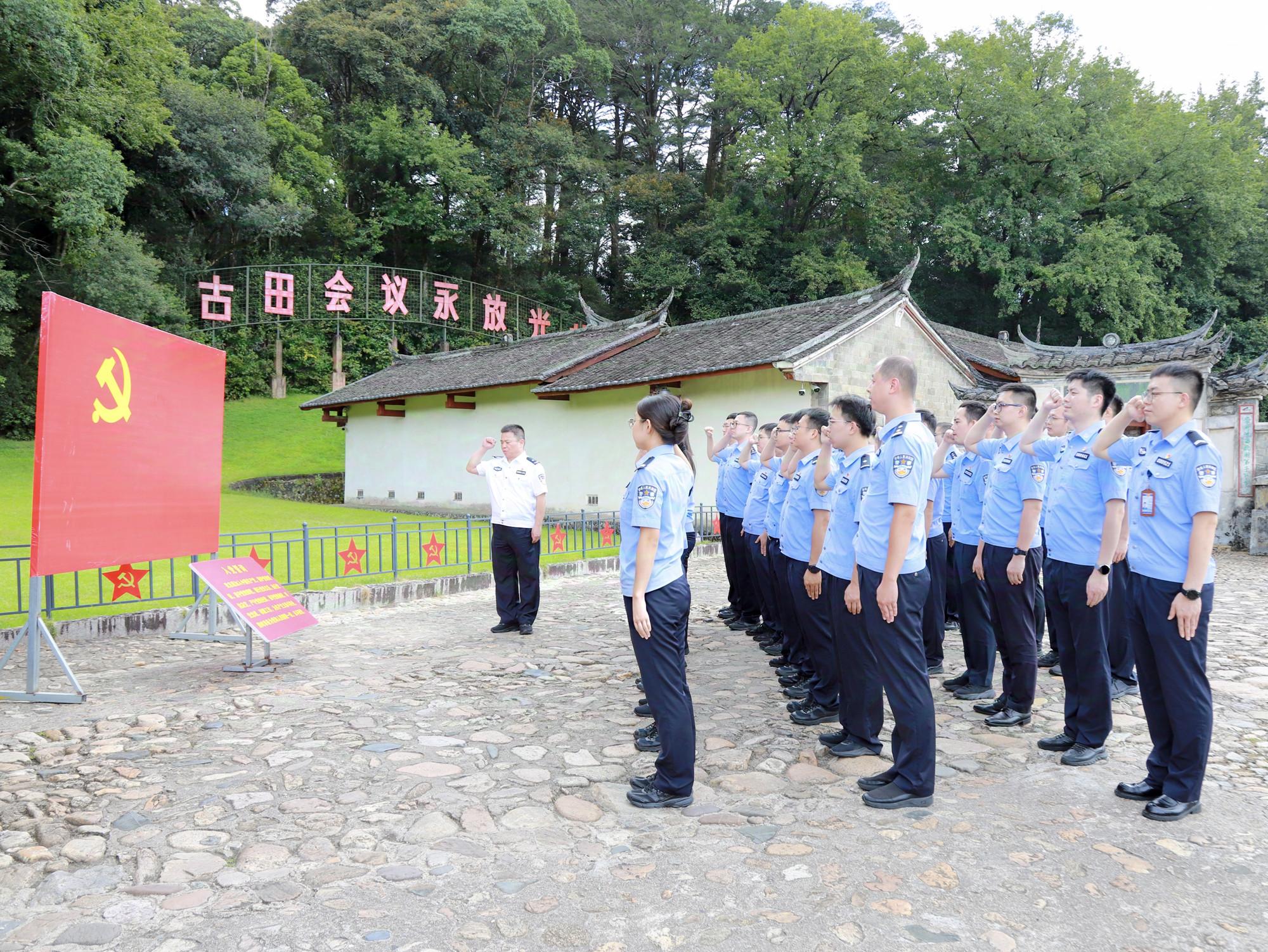 弘揚公安英模精神 激發奮勇爭先動力 ——福建省公安廳開展廳機關青年民警沉浸式忠誠教育 白墻青瓦、青山環抱,9月10日,在古田會議會址旁,30名省公安廳機關青年民警隊列整齊、站姿肅立,舉起右拳、目光堅毅,重溫入黨誓詞,永葆初心使命。