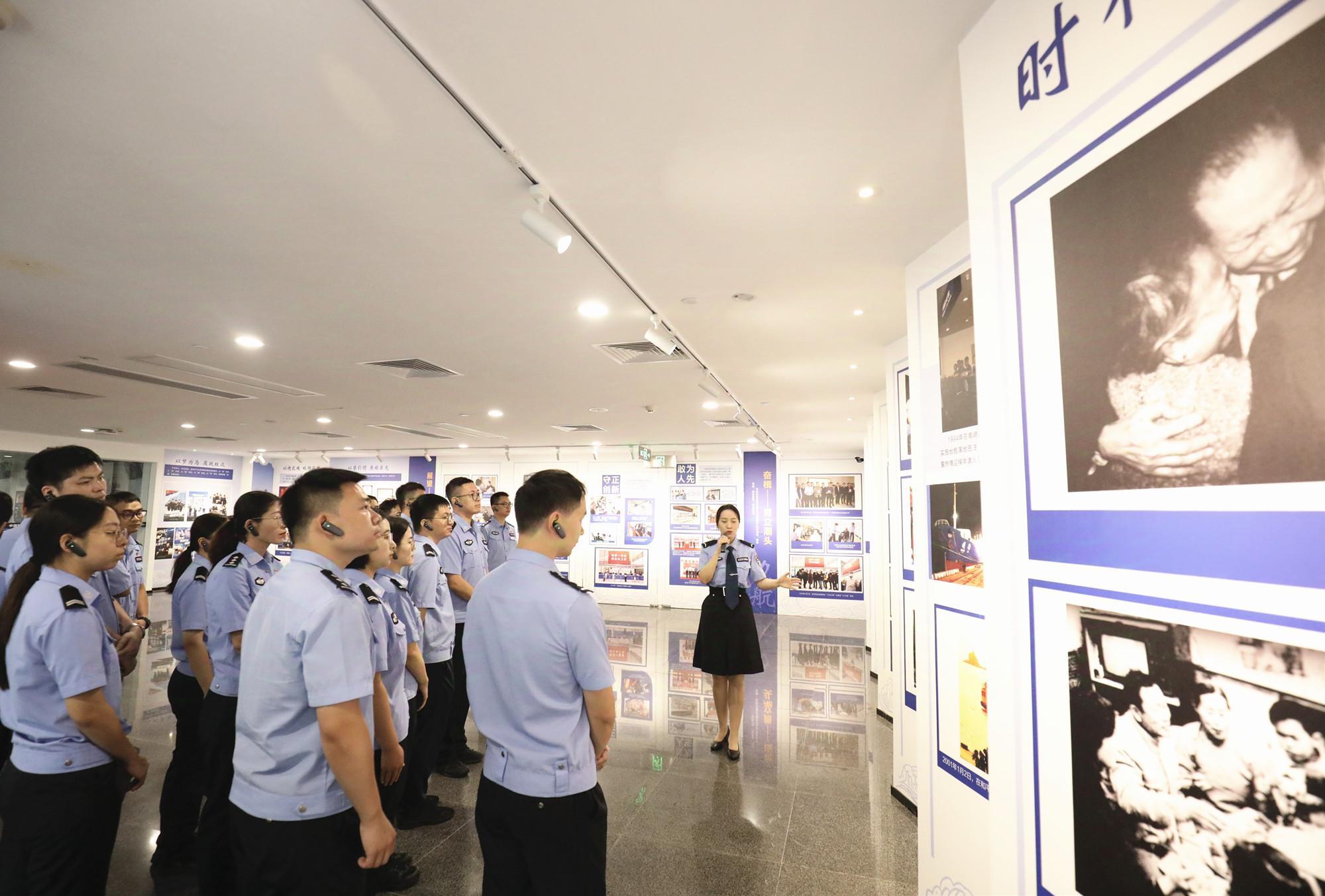青年民警集體參觀龍巖公安警史館。(謝承航 攝) “我們將以革命先輩和公安英模為榜樣,把忠誠融入血脈、付諸行動,傳承好‘紅軍式警隊’的紅色基因,在新時代公安工作中展現青年擔當、貢獻青春力量。”望著古田派出所墻上“永遠聽黨話、永遠跟黨走、永遠為人民”的標語,廳人事處青年民警王佳燕有感而發。 再快一秒,永當“人民的保護神” 9月11日,青年民警走進“漳州110”原址館,只見一根鋼管從3樓直插地面,如此獨特的集合隊伍“出警通道”,讓大家發出陣陣感嘆。接警室里,泛黃的桌上擺放著按鍵式電話機、撥號盤式電話機、黑色對講機以及陳舊的報警案件登記簿,這就是“漳州110”早期的接報警服務臺。
