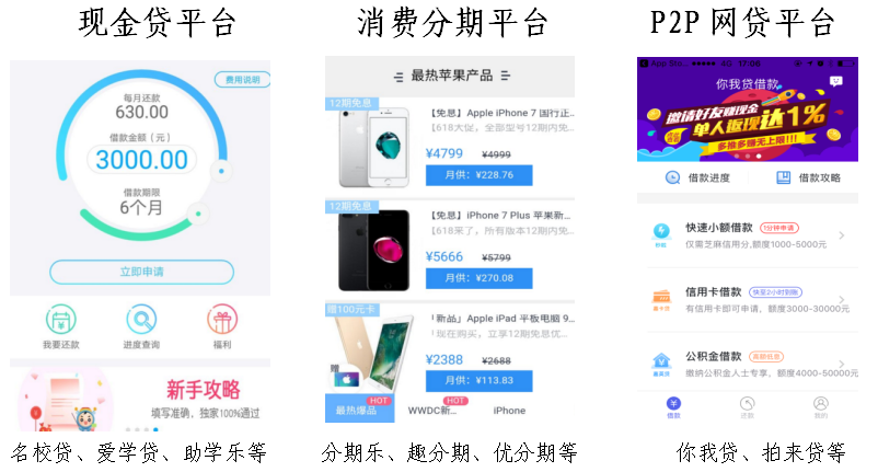 什么是網(wǎng)貸?即通過互聯(lián)網(wǎng)方式,在線申請,在線批核,在線放款的信貸產(chǎn)品(不需要線下面簽)。 什么是校園網(wǎng)貸?針對在校大學生(年滿18周歲)的網(wǎng)貸產(chǎn)品。根據(jù)資金用途,主要表現(xiàn)為現(xiàn)金貸和消費分期(場景)兩種,屬于消費金融的范疇。 校園網(wǎng)貸平臺類型