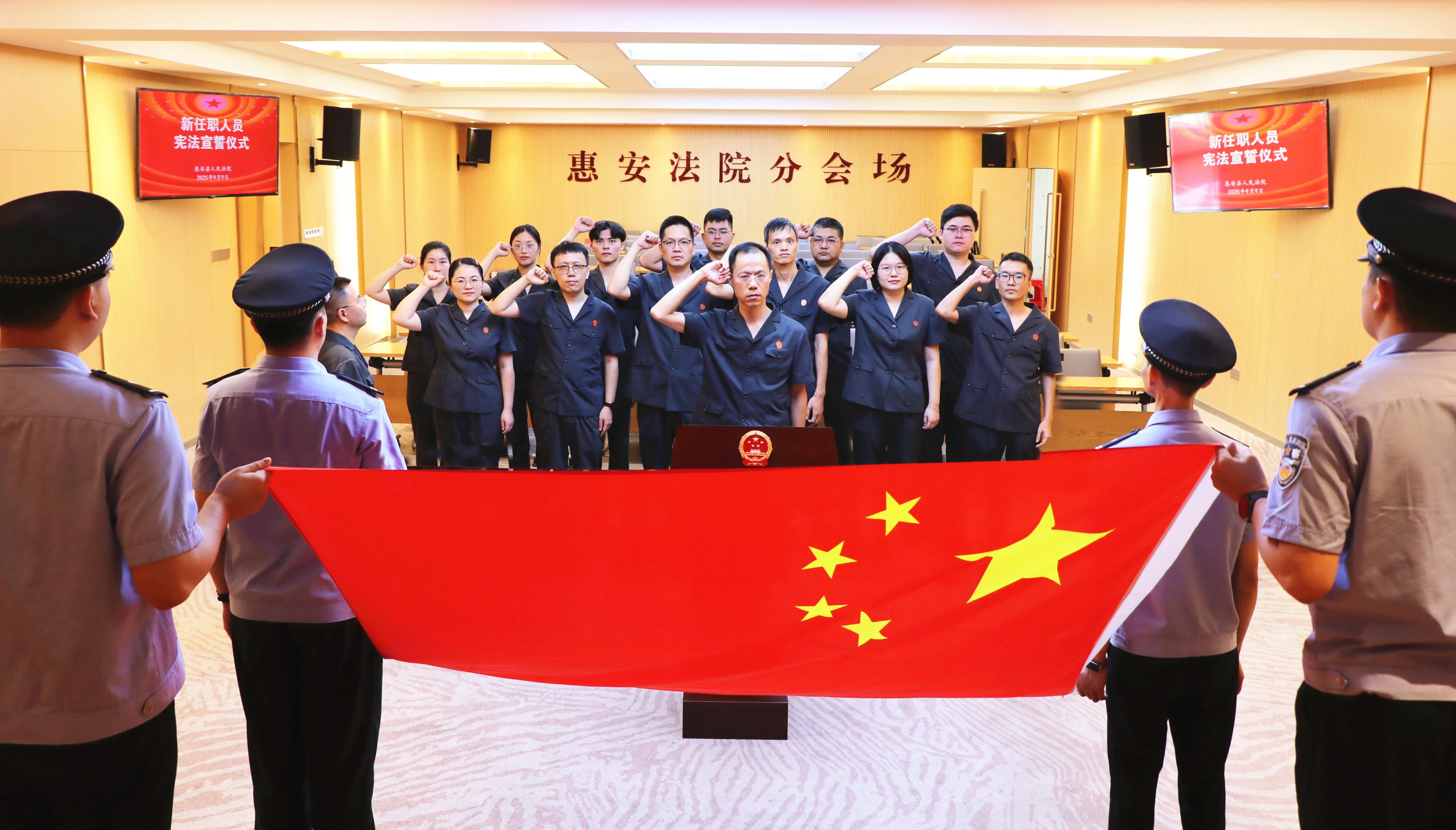 近日,惠安縣人民法院舉行新任職人員任前集體談話暨憲法宣誓儀式。圖為談話結束后,新任職人員面向國旗莊嚴宣誓。 |