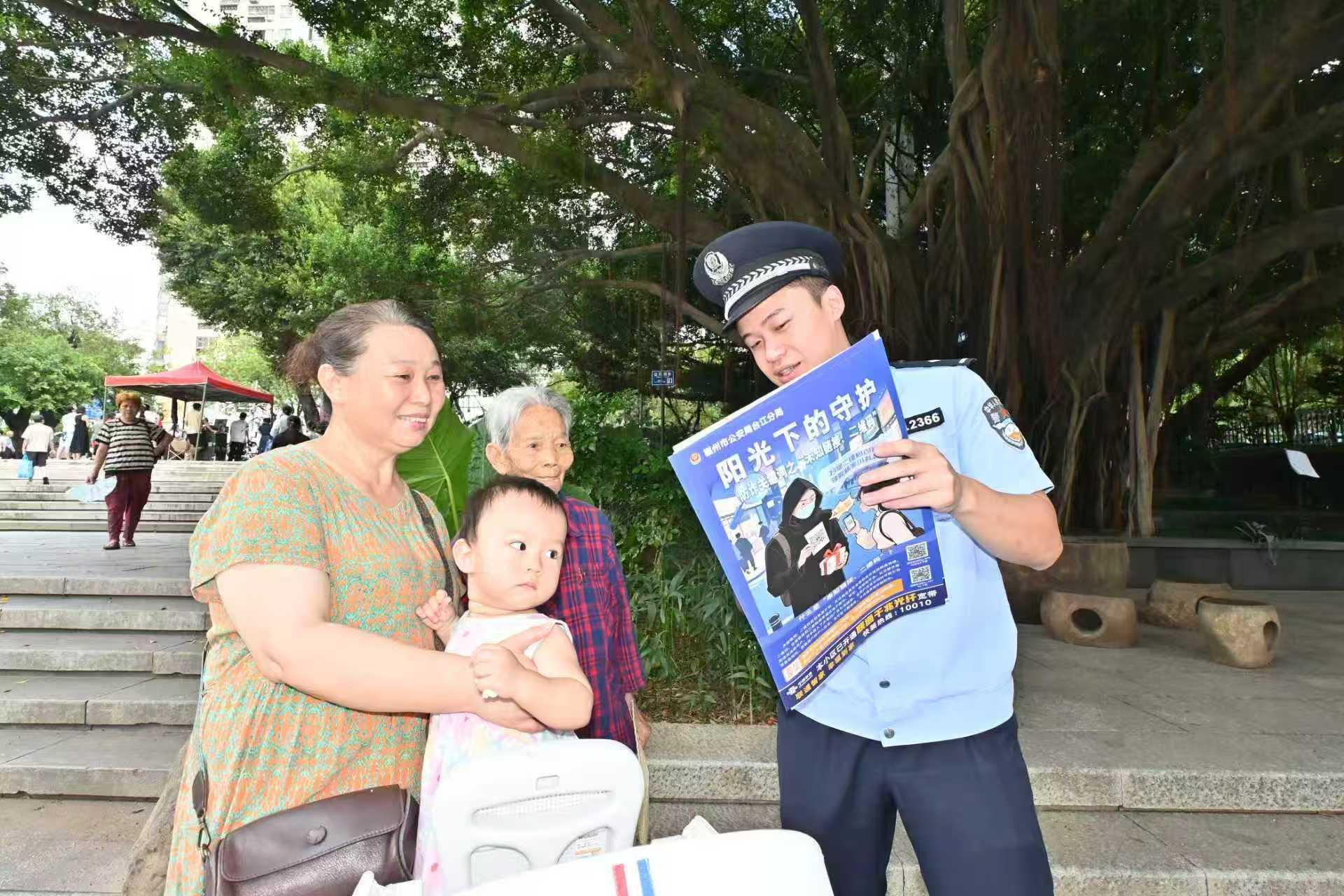 日前,福州市公安局新港派出所民警走進南公園,開展“陽光下的守護”全民反詐主題宣傳活動。圖為民警手持精心制作的宣傳單開展反詐宣傳。 |