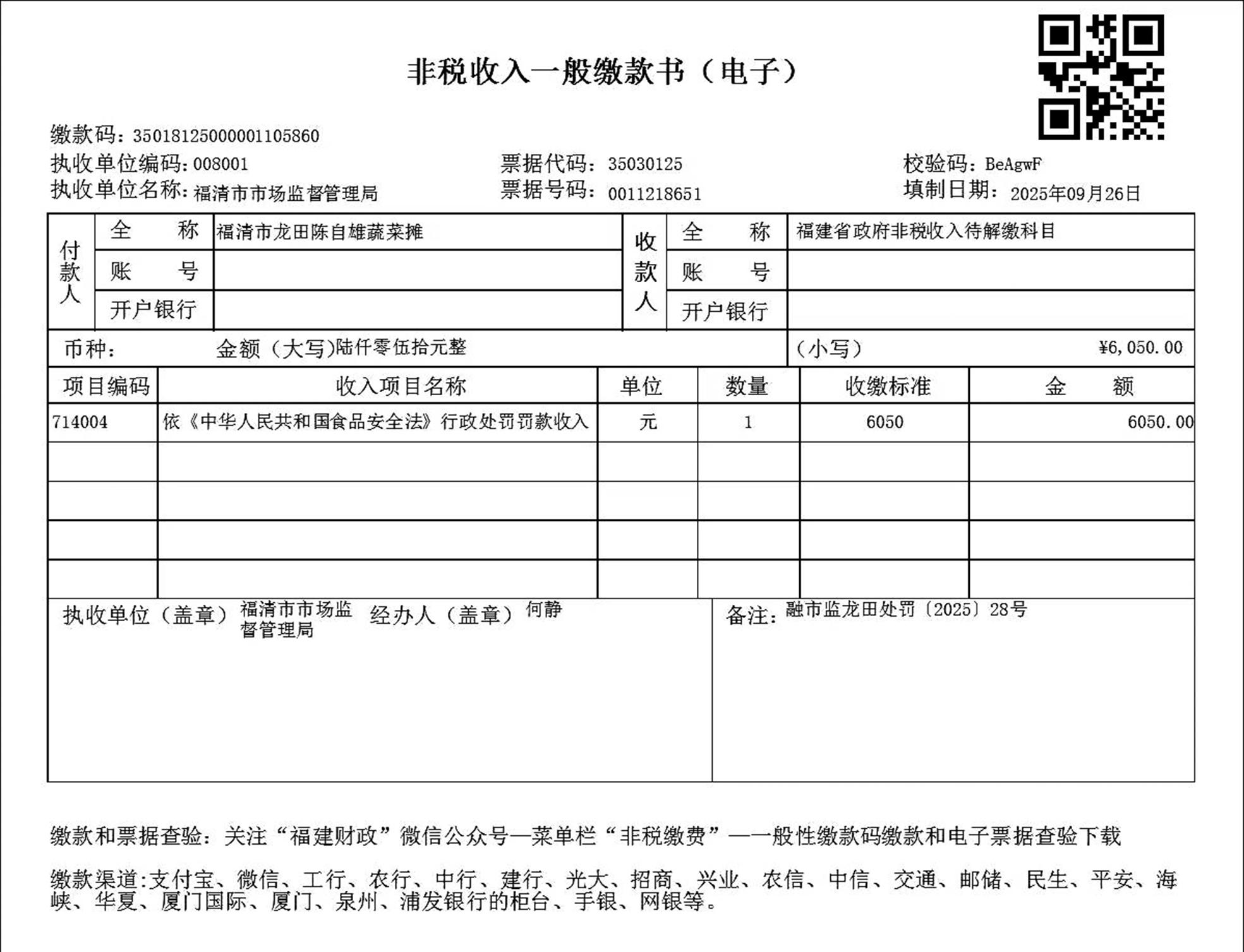 福清市市場監督管理局行政處罰決定書 融市監龍田處罰〔2025〕28號 當事人:福清市龍田陳自雄蔬菜攤,主體資格證照名稱:營業執照,統一社會信用代碼:92350181MA33MWGP9H,系個體工商戶,經營場所:福建省福州市福清市龍田鎮上一村農超市場攤位149、150、151號。 經營者:陳自雄,性別:男,民族:漢,公民身份號碼:350127195706021590,住址:福建省福清市海口鎮晨光村過道35號。 2025年4月16日,我局執法人員收到福建賽福安全技術服務有限公司檢驗報告(№:2025SFJC001608),報告顯示福清市龍田陳自雄蔬菜攤銷售的菜椒的檢驗結論為:噻蟲胺項目檢出:0.063mg/kg,標準指標:0.05mg/kg,不符合GB2763-2021《食品安全國家標準食品中農藥最大殘留限量》要求,檢驗結論為不合格。經核查,當事人的行為涉嫌違反《食用農產品市場銷售質量安全監督管理辦法》第十五條第一款、《中華人民共和國食品安全法》第三十四條第二項的規定,我局執法人員于2025年4月16日對當事人的違法行為予以立案調查。現場未實施行政強制措施。 當事人在法定期限內未向我局申請對上述批次食用農產品進行復檢。 經查,當事人于2025年3月18日以4.4元/kg的價格從無法查證的渠道購進涉案菜椒12.5kg,進貨總價為55元。該批次菜椒經福建賽福安全技術服務有限公司檢驗,檢驗結論為:噻蟲胺項目檢出:0.063mg/kg,標準指標:0.05mg/kg,不符合GB2763-2021《食品安全國家標準食品中農藥最大殘留限量》要求,檢驗結論為不合格。至案發之日止,上述菜椒銷售10kg,銷售均價5元/kg,剩余2.5kg因儲運環節損耗無法銷售,計貨值金額62.5元,計違法所得50元。 當事人采購上述不合格批次的菜椒,未按規定建立食用農產品進貨查驗記錄制度,如實記錄食用農產品的名稱、數量、進貨日期以及供貨者名稱、地址、聯系方式等內容,并保存相關憑證。 當事人于2025年4月16日起張貼召回公告,對售出的涉案不合格批次的菜椒進行召回。 上述事實由以下證據證實: 1、執法人員對當事人經營場所進行現場檢查制作的《現場筆錄》1份,證明執法人員對當事人經營場所現場檢查的相關情況; 2、當事人營業執照復印件、經營者身份證復印件各1份,證明了當事人的主體資格; 3、執法人員對經營者進行詢問調查制作的《詢問筆錄》2份,證明了當事人經營不合格食用農產品的事實情況; 4、福建賽福安全技術服務有限公司《檢驗報告》(№:2025SFJC001608)和《送達回證》各1份,證明涉案菜椒的檢驗情況和我局執法人員于2025年4月16日向當事人送達《檢驗報告》的事實; 5、當事人張貼召回公告的照片2張,證明當事人采取召回措施情況; 6、當事人提交的《整改報告》1份,證明當事人在案發后積極進行整改的事實; 7、執法人員對抽樣單上登記的供應商嚇平嫂蔬菜批發店聯系電話進行撥打詢問的視頻光盤1份及福建省市場監管智慧應用一體化平臺查詢結果截圖1份,證明執法人員無法與抽樣單登記的供應商嚇平嫂蔬菜批發店取得有效聯系。 2025年9月8日,我局依法向當事人制作送達《福清市市場監督管理局行政處罰告知書》(融市監龍田罰告〔2025〕28號)1份,告知當事人擬作出的行政處罰決定以及事實、理由、依據,并告知當事人依法享有陳述、申辯的權利。當事人在法定期限內未提出陳述、申辯意見。 當事人購進食用農產品未按規定查驗合格證明文件的行為違反了《中華人民共和國食品安全法》第五十三條第一款“食品經營者采購食品,應當查驗供貨者的許可證和食品出廠檢驗合格證或者其他合格證明”的規定,依據《中華人民共和國食品安全法》第一百二十六條第一款第三項“違反本法規定,有下列情形之一的,由縣級以上人民政府食品安全監督管理部門責令改正,給予警告:(三)食品、食品添加劑生產經營者進貨時未查驗許可證和相關證明文件,或者未按規定建立并遵守進貨查驗記錄、出廠檢驗記錄和銷售記錄制度”的規定,責令當事人改正上述違法行為,經研究決定:給予警告。 當事人采購食用農產品未建立食用農產品進貨查驗記錄制度的行為違反了《中華人民共和國食品安全法》第六十五條“食用農產品銷售者應當建立食用農產品進貨查驗記錄制度,如實記錄食用農產品的名稱、數量、進貨日期以及供貨者名稱、地址、聯系方式等內容,并保存相關憑證。記錄和憑證保存期限不得少于六個月”的規定,依據《中華人民共和國食品安全法》第一百二十六條第四款“食用農產品銷售者違反本法第六十五條規定的,由縣級以上人民政府食品安全監督管理部門依照第一款規定給予處罰”、第一款“違反本法規定,有下列情形之一的,由縣級以上人民政府食品安全監督管理部門責令改正,給予警告”的規定,責令當事人改正上述違法行為,經研究決定:給予警告。 當事人銷售經檢驗不合格食用農產品的行為,違反了《食用農產品市場銷售質量安全監督管理辦法》第十五條第一款“禁止銷售者采購、銷售食品安全法第三十四條規定情形的食用農產品”及《中華人民共和國食品安全法》第三十四條第二項“禁止生產經營下列食品、食品添加劑、食品相關產品:(二)致病性微生物,農藥殘留、獸藥殘留、生物毒素、重金屬等污染物質以及其他危害人體健康的物質含量超過食品安全標準限量的食品、食品添加劑、食品相關產品”的規定,依據《食用農產品市場銷售質量安全監督管理辦法