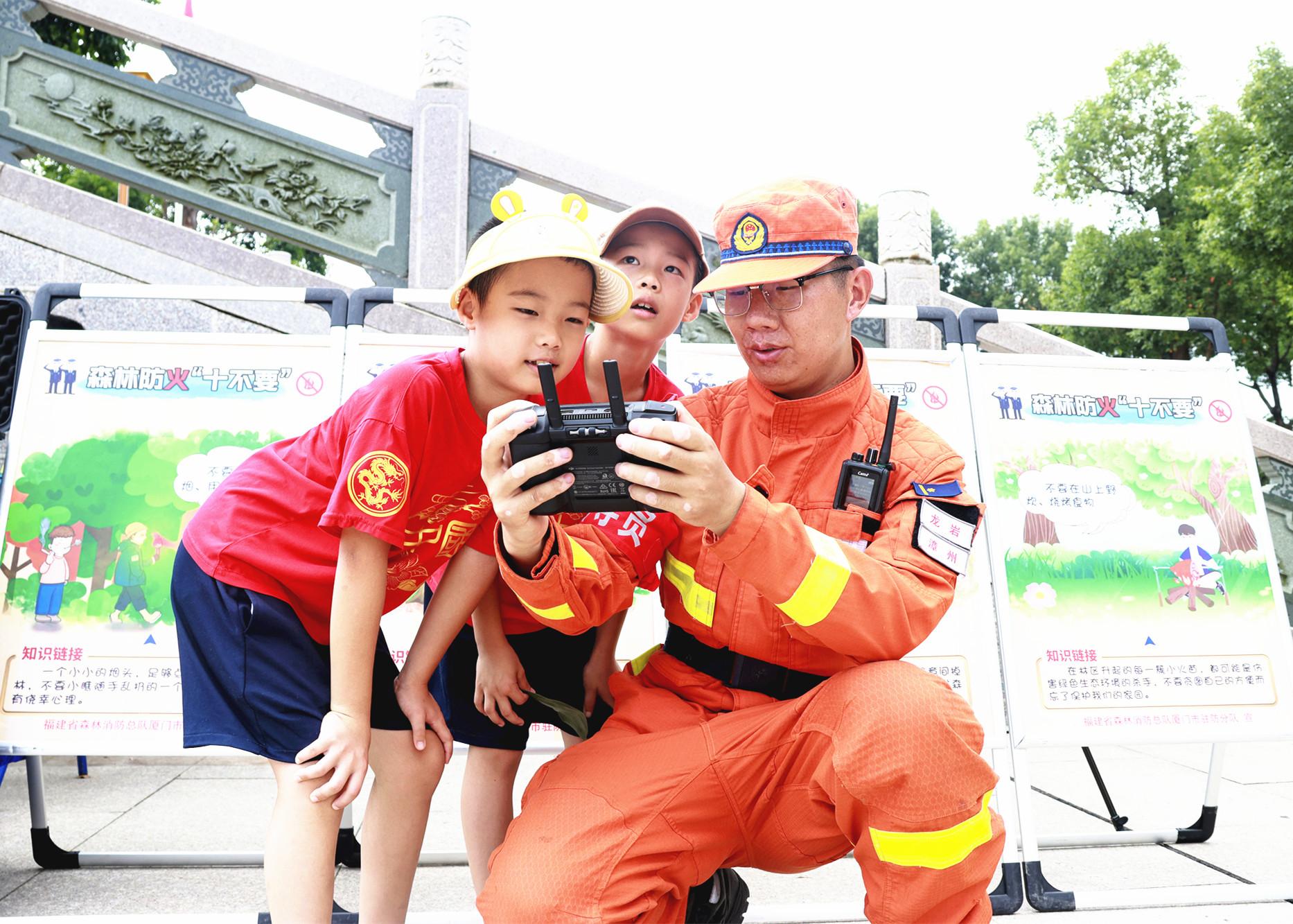 為做好防滅火工作、確保廈門市重點景區林火安全,連日來,省森林消防總隊廈門市駐防分隊在多地開展森林防滅火宣傳活動,筑牢景區森林安全防線。圖為消防員在仙岳山公園與小朋友互動。 |