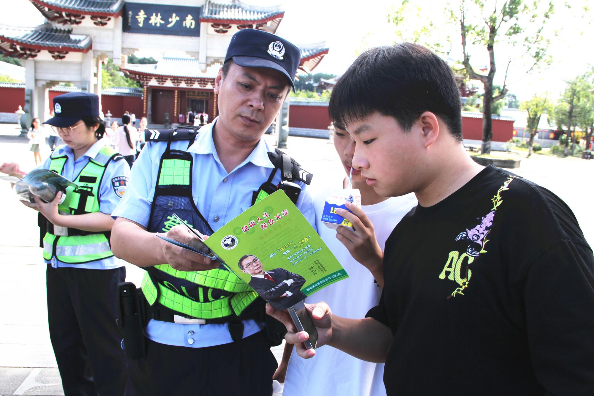 近日,莆田市荔城區禁毒辦攜手荔城公安機關扎實推進禁毒安保各項工作,開展“健康人生 綠色無毒”禁毒宣傳,強化禁毒理念,守護平安祥和。圖為民警在南少林寺景區向游客宣講禁毒知識。 |