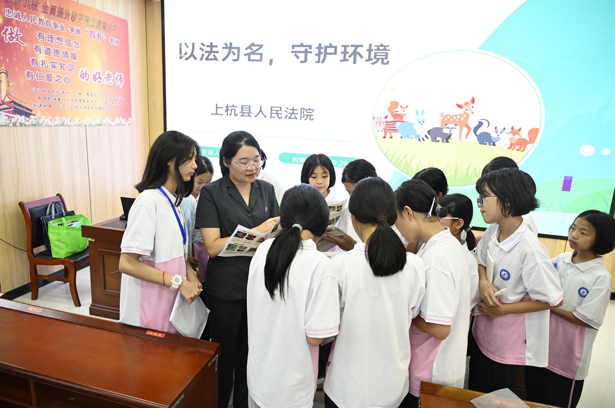 近日,上杭法院聯合縣關工委、教育局等單位走進上杭縣下都中學,為初一新生開展“以法為名,守護環境”主題講座。圖為法官為學生講解涉野生動植物等相關法律法規。 |