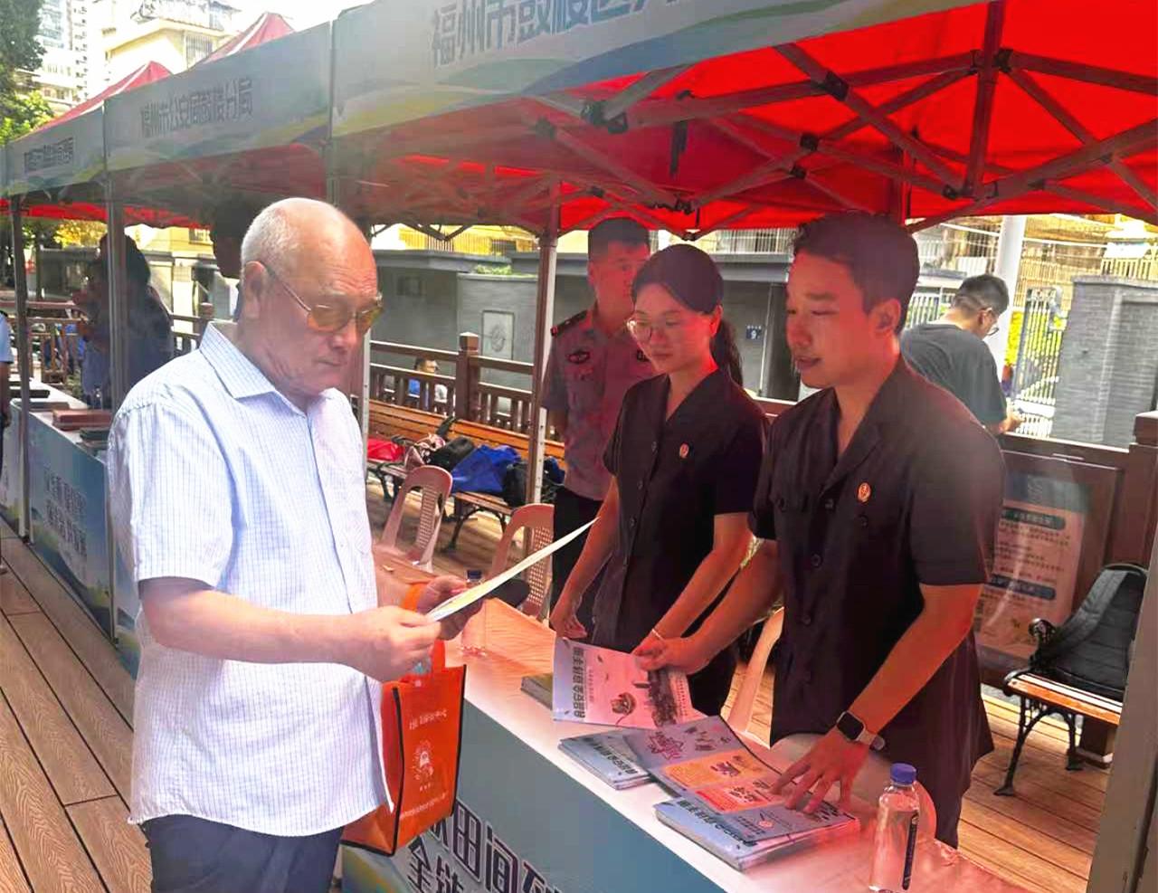 近日,福州市鼓樓區(qū)人民法院刑庭干警前往水部街道建華社區(qū),開展“尚德守法 共享食安”食品安全普法宣傳活動。圖為法院干警向群眾發(fā)放宣傳手冊,講解食品安全法律法規(guī)。 |