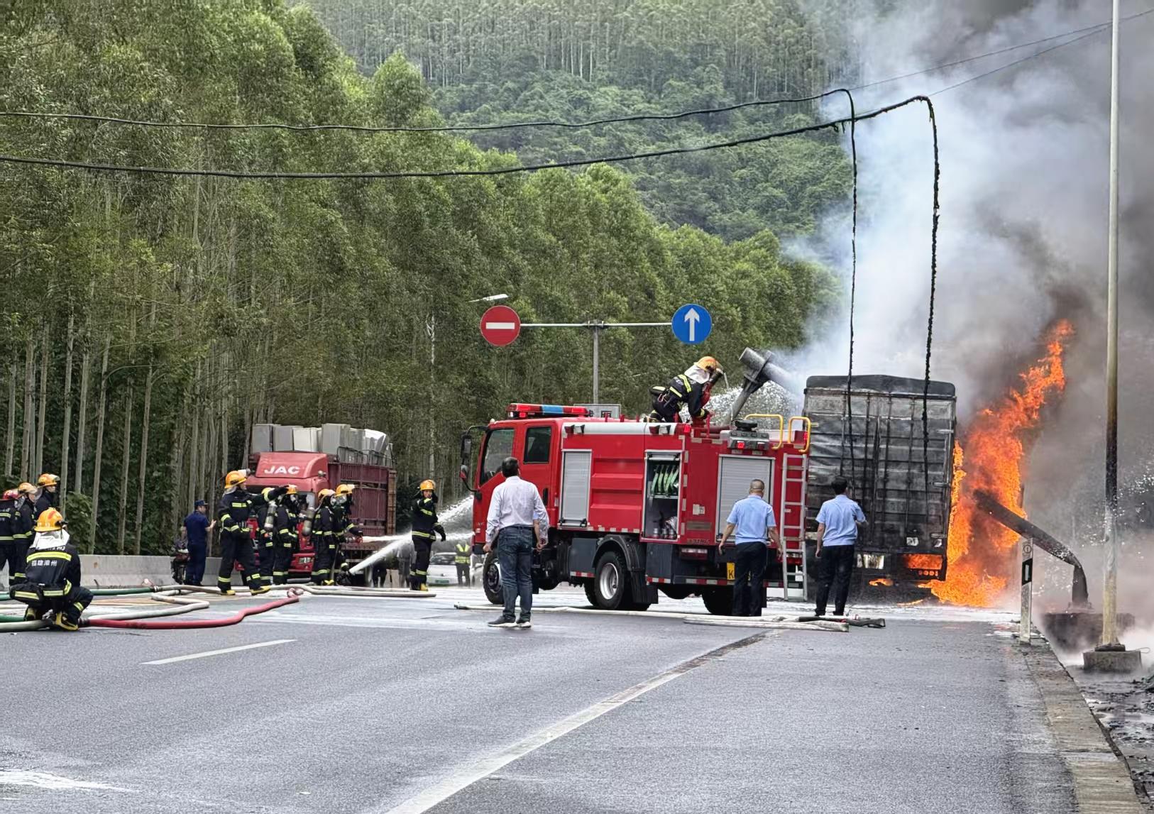 滅火現(xiàn)場 當天,盤陀派出所接警后立即啟動應急處置預案,調配多名值班警力趕赴現(xiàn)場。抵達時,現(xiàn)場已是一片火海,貨車冒出滾滾濃煙,火焰躥起近3米高,駕駛室玻璃因高溫炸裂,車內電路噼啪作響。事發(fā)路段為隧道口附近,正值車流高峰,過往車輛紛紛減速避讓。民警隨即在現(xiàn)場設置警戒區(qū)域,通過喊話引導、手勢指揮等方式,有序分流隧道口及周邊滯留車輛,全力疏通國道來往交通。 消防救援力量抵達現(xiàn)場后,民警與消防員緊密配合,共同開展滅火作業(yè),同時維護現(xiàn)場交通秩序,保障消防通道絕對暢通。經(jīng)過1個多小時的緊張?zhí)幹茫骰鸨怀晒錅纭?/p> |