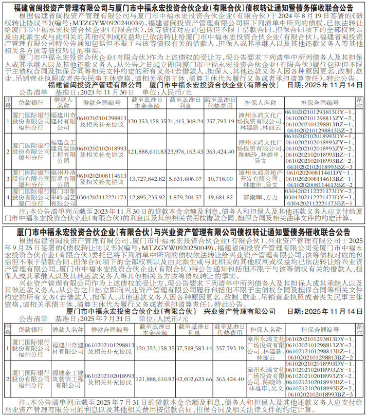關于永泰縣農村信用合作聯社吸收合并福建永泰長信村鎮銀行股份有限公司的公告 為優化金融資源配置,提升金融服務能力,經永泰縣農村信用合作聯社(以下簡稱“永泰農信聯社”)社員代表大會審議通過和福建永泰長信村鎮銀行股份有限公司(以下簡稱“永泰長信村鎮銀行”)獨資股東決定,永泰農信聯社以收購并新設分支機構的方式吸收合并永泰長信村鎮銀行。本次吸收合并完成后,永泰長信村鎮銀行將注銷法人資格,新設為永泰農信聯社下屬營業網點。 本次吸收合并事項尚需監管部門批準,具體以監管部門的批復文件為準。 永泰農信聯社將依法依規辦理吸收合并相關手續。本次吸收合并后,將永泰長信村鎮銀行機構原址改建為永泰農信聯社下屬營業網點。永泰長信村鎮銀行的全部資產、權利等歸屬于永泰農信聯社,永泰長信村鎮銀行的全部負債、責任、義務等由永泰農信聯社承繼。永泰長信村鎮銀行的存款客戶屆時可至永泰農信聯社下屬任一營業網點繼續辦理相關業務,永泰長信村鎮銀行的貸款客戶屆時可至其戶籍所在地、經常居住地、工作地或者經營地所在的永泰農信聯社下屬營業網點繼續辦理相關業務。永泰農信聯社的名稱、經營范圍不因本次吸收合并而改變。 為保障債權人的合法權益,永泰農信聯社、永泰長信村鎮銀行的債權人有權根據《中華人民共和國公司法》等有關法律、法規的規定,要求債務清償或者提供相應擔保;未提出要求的,不影響其合法享有的債權的有效性。 特此公告。 服務電話:0591-24836069。(客服時間:工作日上午08:00-12:00,下午14:30-17:30)。 永泰縣農村信用合作聯社 福建永泰長信村鎮銀行股份有限公司 2025年11月14日 遺失聲明 福清市人民法院鄭而華不慎遺失由福清市人民法院印制蓋章的執行公務證,有效期限:2021年2月24日-2026年2月23日,證件編號:3511278,現聲明作廢。 聲明人:鄭而華 2025年11月14日 張煥玉: 本會受理申請人保利物業服務股份有限公司福州分公司與被申請人張煥玉之間的物業服務合同糾紛案[(2025)榕仲受812號],現向你公告送達《案件受理通知書》《仲裁規則》《仲裁員名冊》《仲裁申請書》及證據材料等。本公告自發出之日起60日即視為送達。答辯、選定仲裁員期限為公告期滿后10日內,舉證期限為公告期滿后10日內。本案將于選定仲裁員期限屆滿后第一個工作日組成仲裁庭,于2026年2月9日下午15:00在本會第一仲裁室開庭審理。請于仲裁庭組成后第一個工作日到本會領取《仲裁庭組成人員通知書》《開庭通知書》,逾期,視為送達。 福州仲裁委員會 2025年11月14日 林演: 本會受理申請人保利物業服務股份有限公司福州分公司與被申請人林演之間的物業服務合同糾紛案[(2025)榕仲受813號],現向你公告送達《案件受理通知書》《仲裁規則》《仲裁員名冊》《仲裁申請書》及證據材料等。本公告自發出之日起60日即視為送達。答辯、選定仲裁員期限為公告期滿后10日內,舉證期限為公告期滿后10日內。本案將于選定仲裁員期限屆滿后第一個工作日組成仲裁庭,于2026年2月9日下午15:00在本會第一仲裁室開庭審理。請于仲裁庭組成后第一個工作日到本會領取《仲裁庭組成人員通知書》《開庭通知書》,逾期,視為送達。 福州仲裁委員會 2025年11月14日 林昌勇: 本會受理申請人保利物業服務股份有限公司福州分公司與被申請人林昌勇之間的物業服務合同糾紛案[(2025)榕仲受819號],現向你公告送達《案件受理通知書》《仲裁規則》《仲裁員名冊》《仲裁申請書》及證據材料等。本公告自發出之日起60日即視為送達。答辯、選定仲裁員期限為公告期滿后10日內,舉證期限為公告期滿后10日內。本案將于選定仲裁員期限屆滿后第一個工作日組成仲裁庭,于2026年2月9日下午15:00在本會第一仲裁室開庭審理。請于仲裁庭組成后第一個工作日到本會領取《仲裁庭組成人員通知書》《開庭通知書》,逾期,視為送達 福州仲裁委員會 2025年11月14日 張春燕: 本會受理申請人保利物業服務股份有限公司福州分公司與被申請人張春燕之間的物業服務合同糾紛案[(2025)榕仲受820號],現向你公告送達《案件受理通知書》《仲裁規則》《仲裁員名冊》《仲裁申請書》及證據材料等。本公告自發出之日起60日即視為送達。答辯、選定仲裁員期限為公告期滿后10日內,舉證期限為公告期滿后10日內。本案將于選定仲裁員期限屆滿后第一個工作日組成仲裁庭,于2026年2月9日下午15:00在本會第一仲裁室開庭審理。請于仲裁庭組成后第一個工作日到本會領取《仲裁庭組成人員通知書》《開庭通知書》,逾期,視為送達。 福州仲裁委員會 2025年11月14日 福州市臺江區勞動人事爭議仲裁委員會公告 福州市臺江區禾元美容美發店(個體工商戶): 本委已立案受理申請人游思晨訴你(單位)有關確認勞動關系、工資、休息日加班工資、經濟補償金爭議仲裁案件,因你(單位)作為本案被申請人且無法聯系,根據《勞動人事爭議仲裁辦案規則》第二十條第三款規定,現依法向你單位公告送達本委臺勞人仲案字[2025]第907號《被申請人參加仲裁通知書》《開庭通知書》、仲裁申請書副本及證據副本(開庭時間定為2026年1月6日08時45分,地點為福州市臺江區安南路18號群升商務中心五樓第一仲裁庭)。限你單位自本公告發布之日起三十日到本委(福州市臺江區安南路18號群升商務