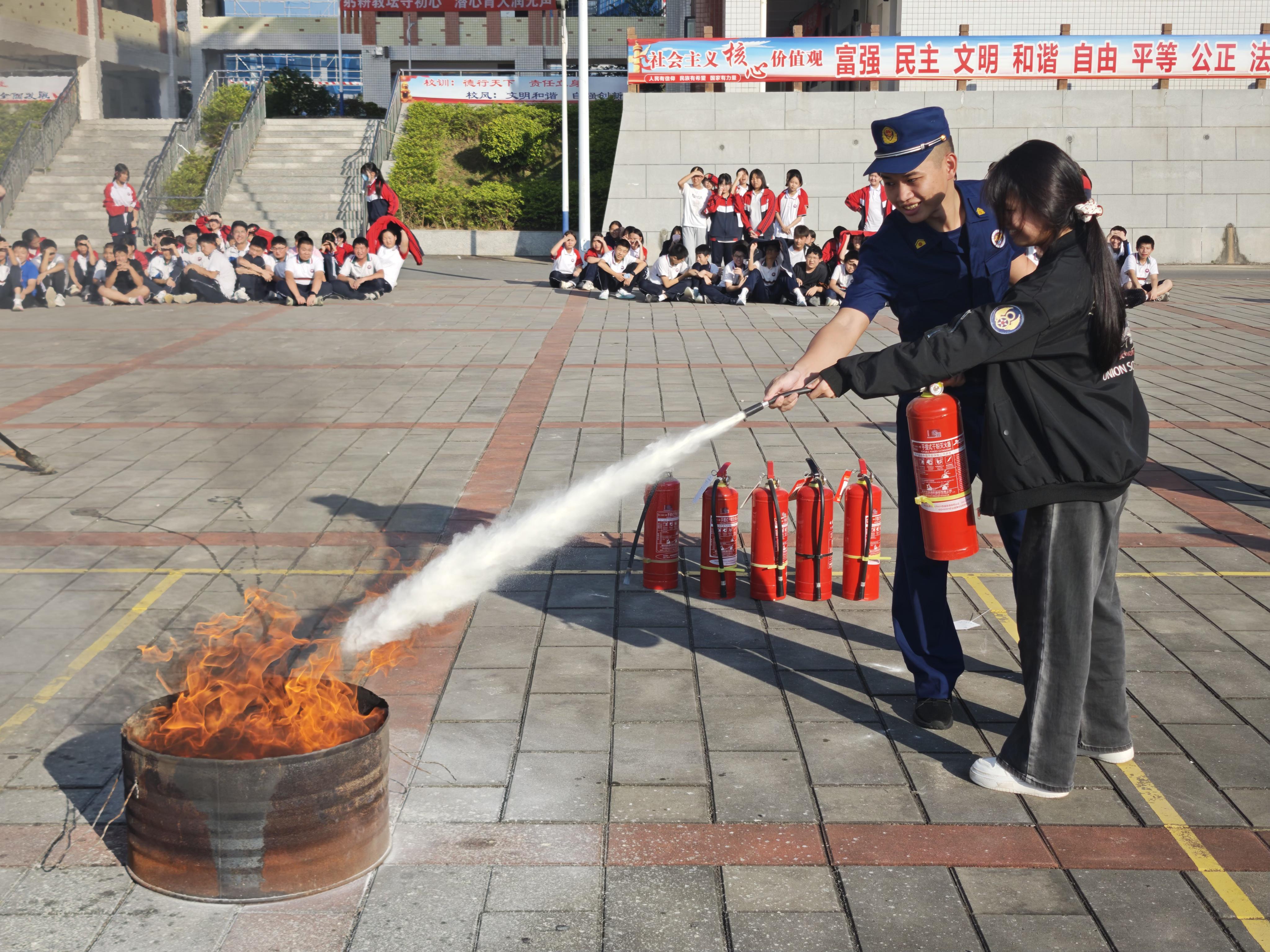 近日,漳州市長泰區消防救援大隊消防員走進興泰中學,為師生帶來一場生動的滅火器實操培訓。圖為消防員通過講解與示范相結合的方式,指導學生操作滅火器。 |