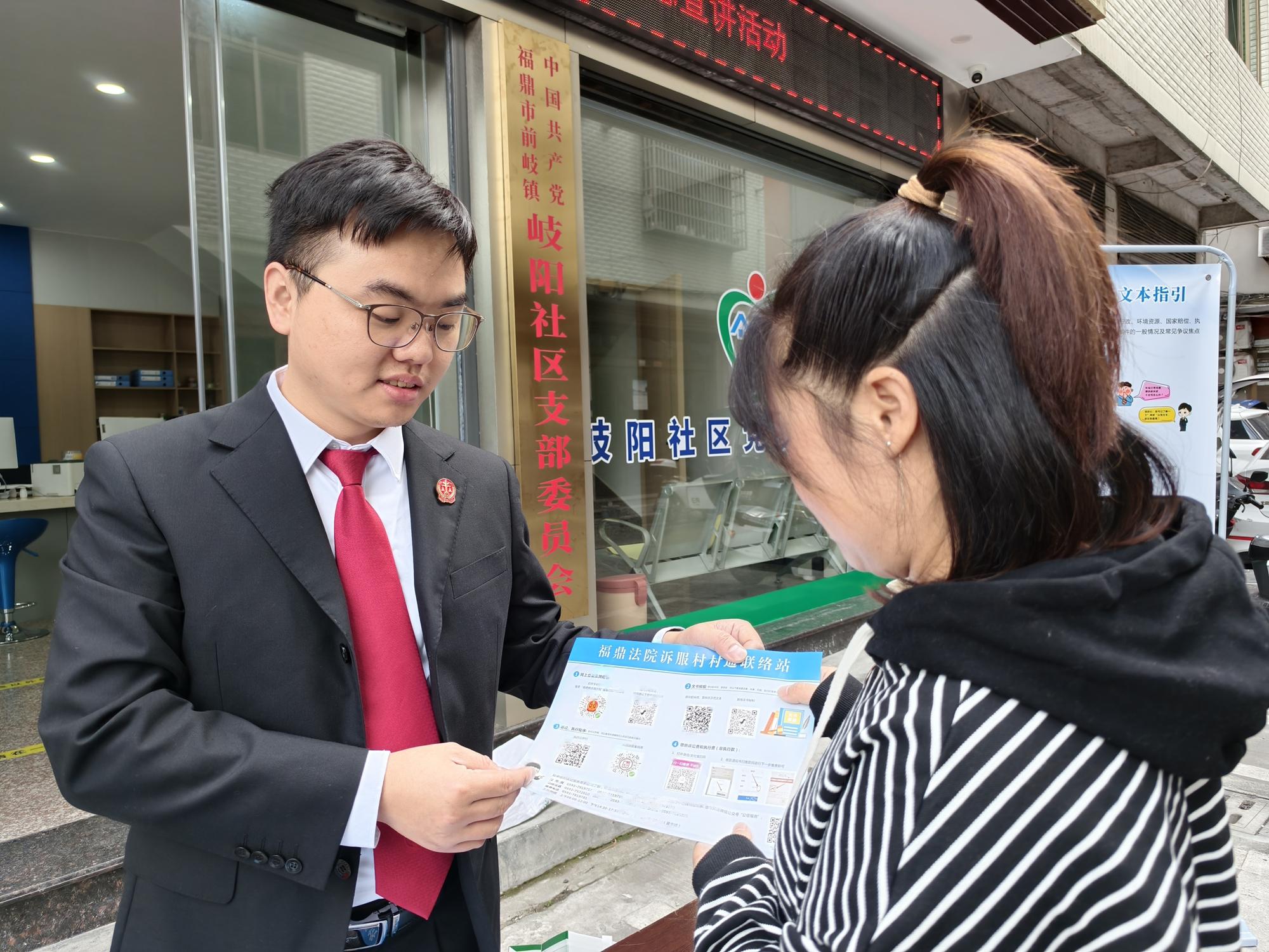 11月17日,福鼎市人民法院組織干警到前岐鎮(zhèn)岐陽(yáng)社區(qū)開(kāi)展普法宣傳活動(dòng)。活動(dòng)中,干警在現(xiàn)場(chǎng)布置了“訴服村村通”和“兩狀示范文本”指引展板,并通過(guò)發(fā)放宣傳單、案例宣講、現(xiàn)場(chǎng)指導(dǎo)網(wǎng)上立案等方式,向群眾介紹最新的司法便民服務(wù)。 |