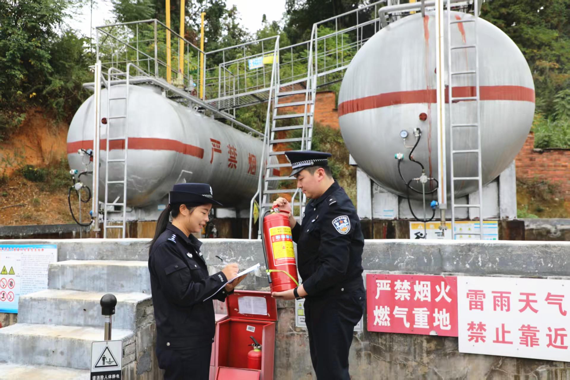 近日,建寧縣公安局經偵大隊聯合縣住房和城鄉建設局、市場監督管理局、應急管理局等職能部門組成燃氣安全聯合檢查組,開展燃氣安全領域專項檢查行動。圖為檢查組在建寧某燃氣有限公司檢查消防器材的有效性。 |