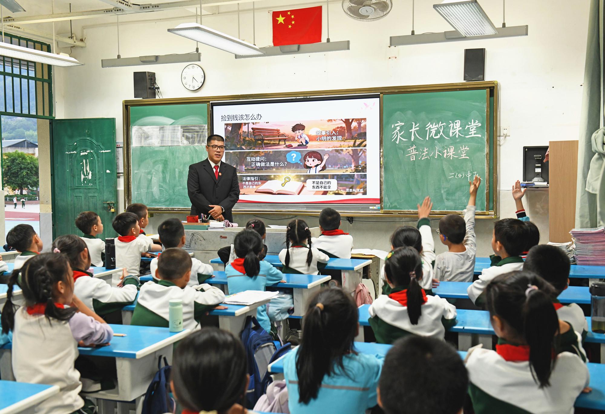 近日,尤溪縣人民法院干警走進尤溪縣實驗小學,開展“法治宣傳進課堂”主題活動。活動中,干警結合小學生認知特點,通過趣味案例、互動問答、情景模擬等形式,用通俗生動的語言講解法律常識,引導學生樹立正確的權利義務觀念。圖為干警與學生們互動交流。 |