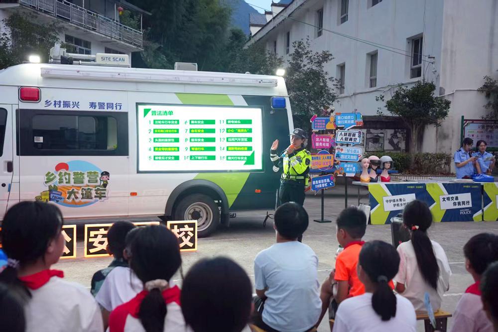 9月4日,在“螢火蟲計劃“犀溪站,宣講員展示大篷車上的普法清單。 針對農村不同群體的差異化特點,壽寧縣公安局推出更具針對性的精準宣傳策略。聚焦“一老一小”重點群體,女子騎行中隊在坑底鄉孝老食堂用地道的方言演繹交通安全三句半,以家常話為老年村民普及安全知識;在下黨鄉,10名少先隊員組成“尋寶少年先遣隊”,開展“古村探秘·安全尋寶記”活動,孩子們在趣味探索中學習交通安全知識,并通過“小手拉大手”方式,將安全理念傳遞給家人。聚焦生產生活需求,該局針對武曲鎮茶農、果農多的特點,定制“山路崎嶇果實甜,謹慎駕駛家才圓”等專屬交通安全提示牌,在茶園、果園埂邊設置醒目警示;在竹管垅鄉,組建“背包警務服務隊”,深入茶山、稻田與村民家中普及交通安全法規,開展便民服務;在托溪鄉,開設“安全‘鄉’遇小賣鋪”,群眾通過體驗“鬼探頭模型”“盲區展示板”等道具學習交通安全知識,在邊玩邊學中增強安全意識。 |